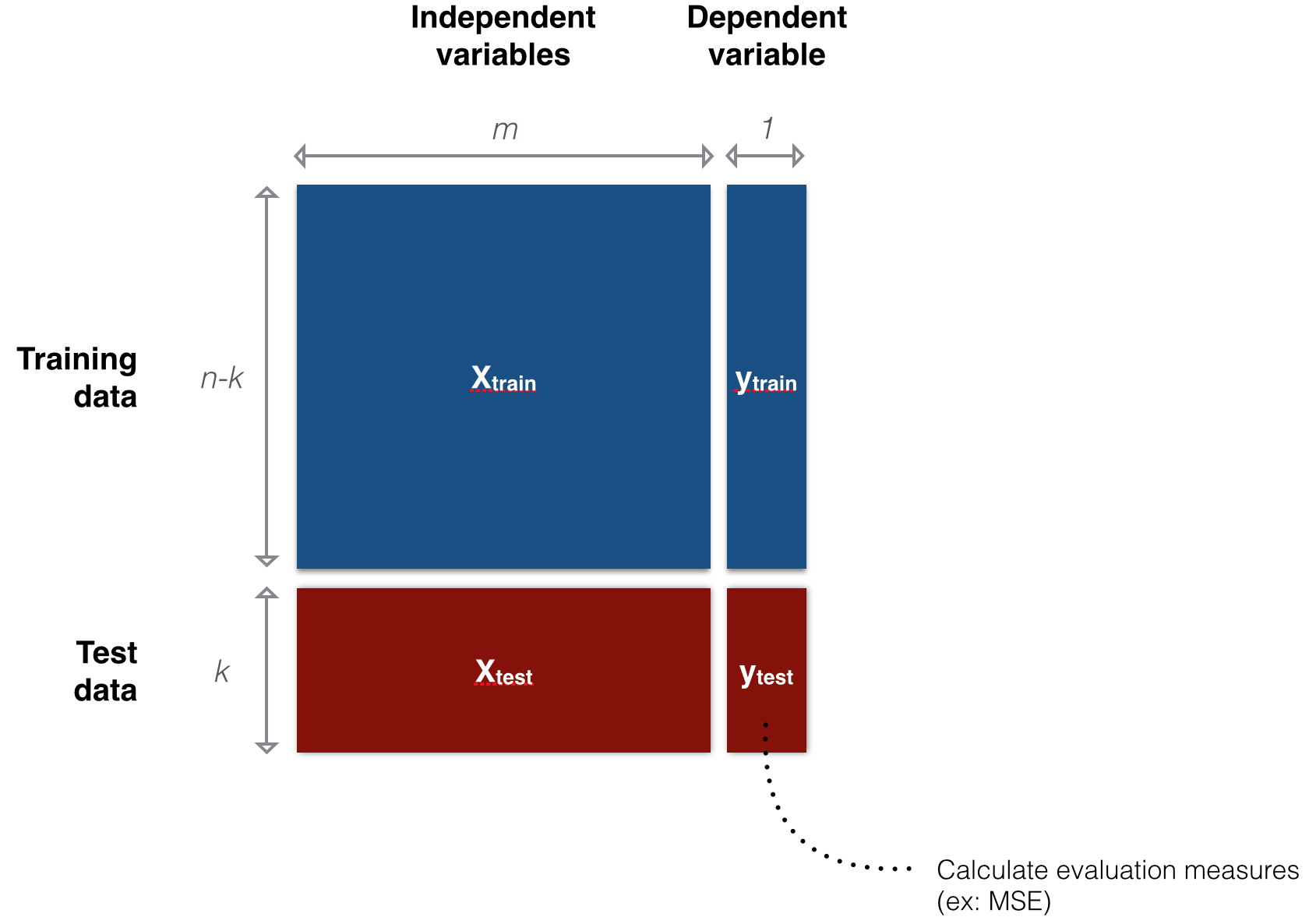 - Testing phase: 컴퓨터가 training data로 모델을 학습한 후에는 교사가 컴퓨터에게 정답(ytest) 없이 문제(Xtest)만 포함된 시험(test data)을 전달한다. 이 때, 컴퓨터가 제출한 답안지(y^)와 실제 정답(ytest)간의 차이를 비교해서 오답/오류(error)가 얼마나 발생했는지 확인함으로써 모델의 성능/성적을 평가한다.