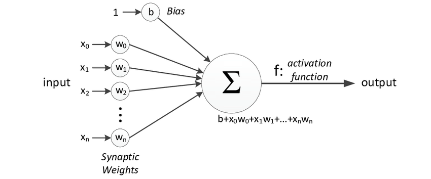 입력신호(x0, x1, ...)가 뉴런에 입력되면 각각 고유한 가중치(weights, w0, w1, ...)가 곱해지는데