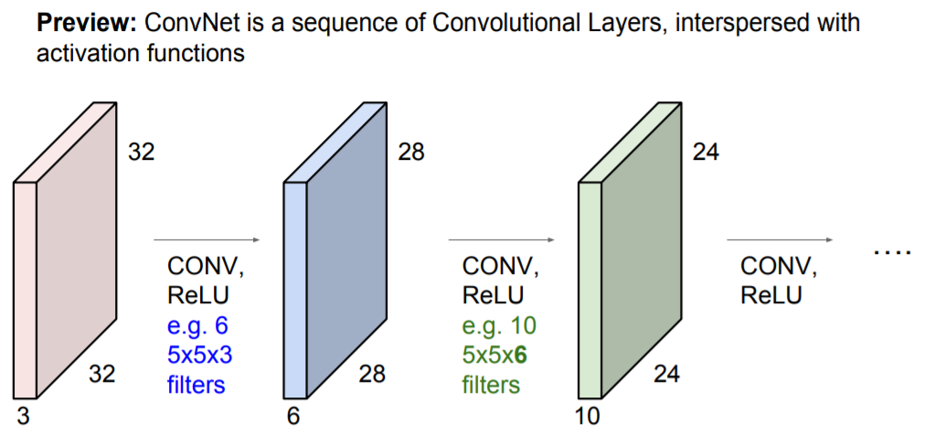 제일 처음 CNN의 구조를 보여줬던 사진에 나와있듯이 CNN은 Convolution Layer의 연속된 형태 입니다.