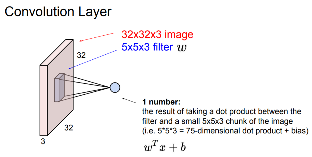 Convolution Layer에서는 필터를 가지고 input 이미지를 슬라이딩하면서 공간적으로 내적(dot product)을 수행하게 됩니다.
