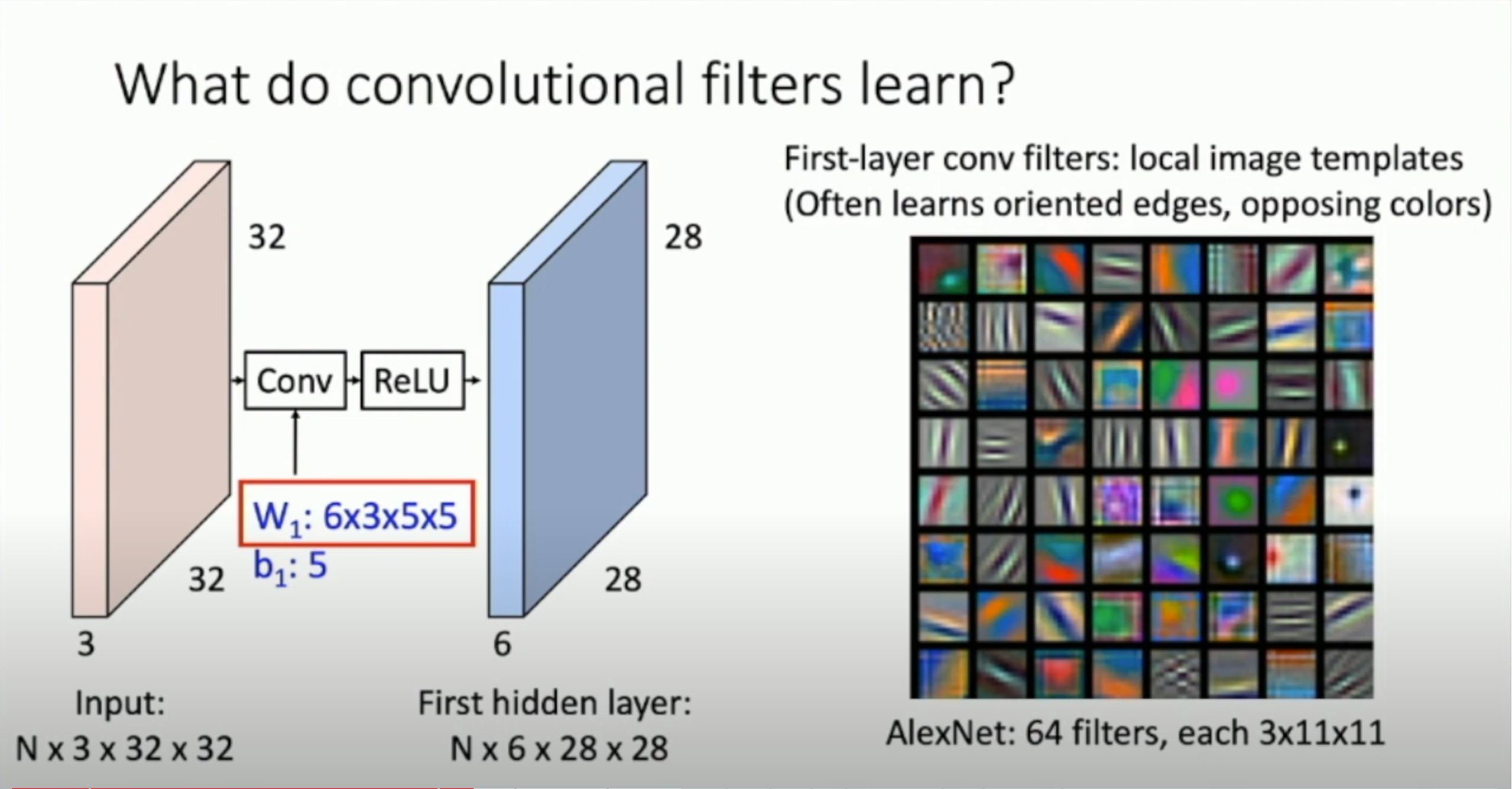 Alexnet을 봤을때 첫번째 Layer에 있는 필터들은 low-level feature(local image templates : 수직 또는 수평 edge, opposing color)를 학습합니다.