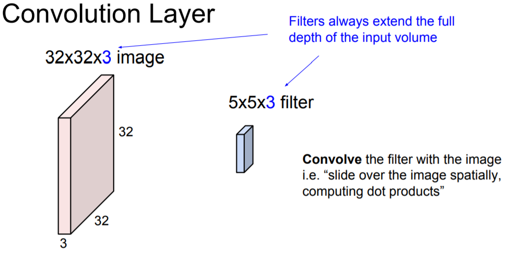 이때 필터는 input 이미지의 깊이(depth)만큼 확장됩니다.(즉 항상 input의 depth와 filter의 depth는 동일합니다.)