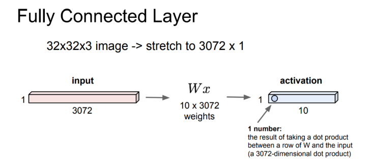 32*32*3 사이즈의 image 파일을 input으로 받게 되면 FCL은 input을 flat하게 stretch해서 1 * 3072의 벡터로 만듭니다.