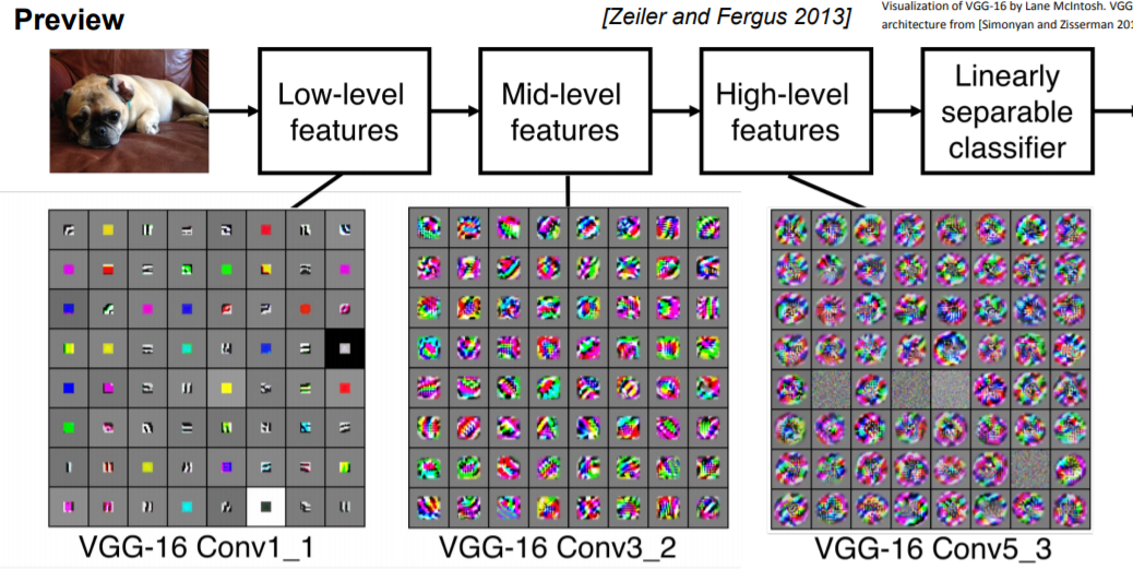 그러므로 여러개의 Layer들을 쌓고나서 보면 layer의 각 필터들이 계층적(low to high level)으로 학습을 하는것을 볼 수 있습니다.